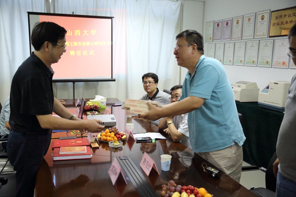 2014年7月21日,山西大學物電學院馬杰副院長帶領的訪問團一行5人到公司商談技術交流合作。期間舉行了研究生導師聘任儀式,公司董事長馮俊博先生正式被聘為山西大學電子與通信工程專業碩士生導師。雙方就各自基本情況與需求進行了對接,決定今后在產學研方面充分發揮互補優勢,提高技術成果的轉化率,促進校企之間共贏發展。