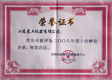 2009年1月19日,淄博高新技術創業服務中心召開了2009年工作會議,會議通報并表彰了創業服務中心一批發展好、貢獻大、經濟效益與科技創新協調發展的孵化企業。我公司榮獲了創業服務中心“2008年度十佳孵化企業”,并被授予了“十佳孵化企業”獎牌和證書。