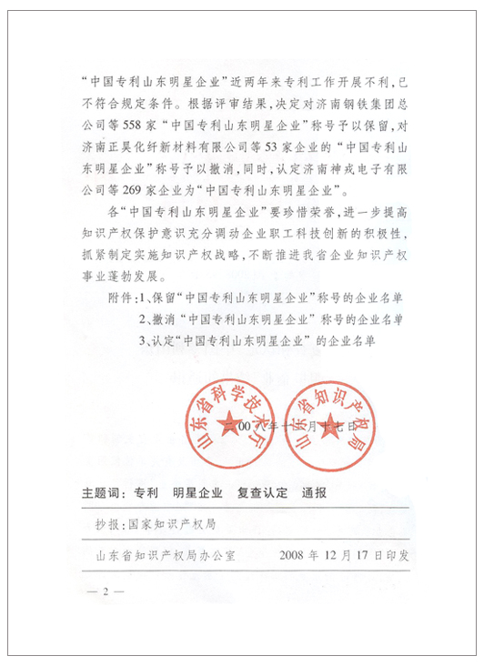 我市及有關單位對我省已認定的“中國專利山東明星企業”進行了認真復查認定,同時組織申報了新一批企業。我公司順利通過了評審委員會的評審認定工作,被認定為“中國專利山東明星企業”。評審結果在山東省科學技術廳、山東省知識產權局文件——《關于復查和認定中國專利山東明星企業》中予以通報。